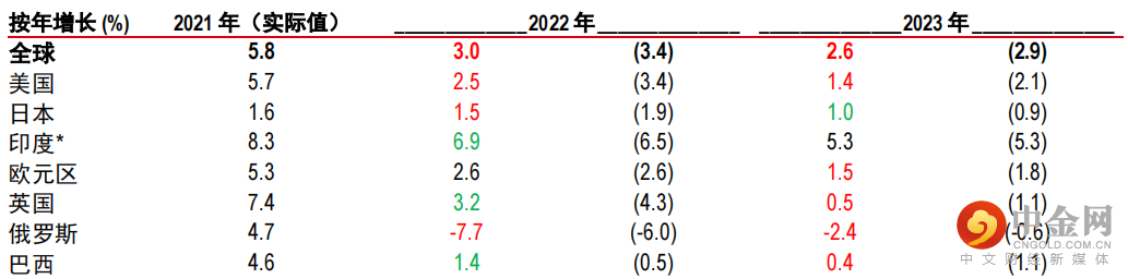 资料来源:注:*为便于比较,印度数据为日历年度预测。此前预测在括号中显示,来自2022年5月25日的上一期宏观月刊。绿色表示上调,红色表示下调。