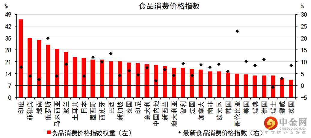 3.食品价格迅速上涨——在许多新兴市场经济体中,食品价格在消费价格指数中所占比重很大