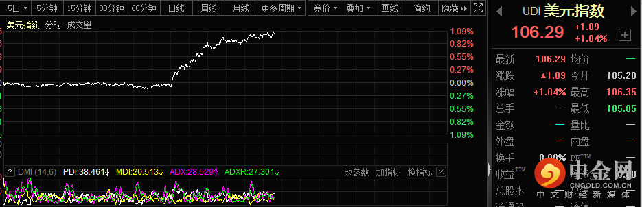 受此影响,美元指数一顿狂拉。美元指数日内涨幅一度达到1.1%,亦创20年新高,最高一度达106.33,后续可能还有新高。