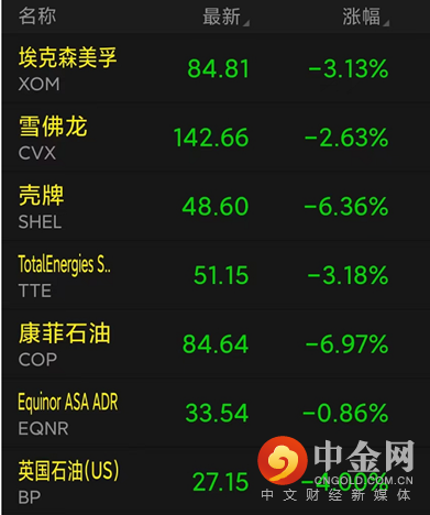 国际油价大幅下跌,美国原油期货价格近两个月来首次跌破每桶100美元。受此影响,美股能源板块盘中持续走弱。