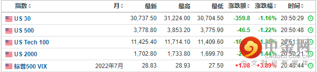 截至收盘,道琼斯指数下跌129.44点,跌幅0.42%,报30967.82点,早盘一度跌超700点;标普500指数收盘上涨6.06点,涨幅0.16%,报3831.39点,盘初曾跌近2.2%;纳斯达克综合指数收盘上涨194.39点,涨幅1.75%,报11322.24点,盘初一度跌超1.9%,振幅达3.71%。