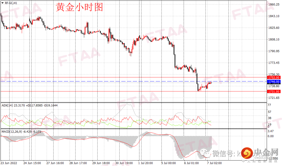 黄金期货周三延续大跌,最高1771.20,最低1730.70,日图再度收出长阴线,显示空头继续发力,两连阴空头强大,日图级别或延续跌势。昨日公布的美联储6月FOMC会议纪要显示货币政策偏鹰派,官员们认为通胀前景恶化的情况下需要加快加息步伐。金价昨日亚盘震荡,欧盘时段下行,美盘时段加速向下。短线或延续偏空。今早亚盘金价小幅反弹,操作上可持有空单,或逢高在1746附近轻仓空,止损1752,目标1731。