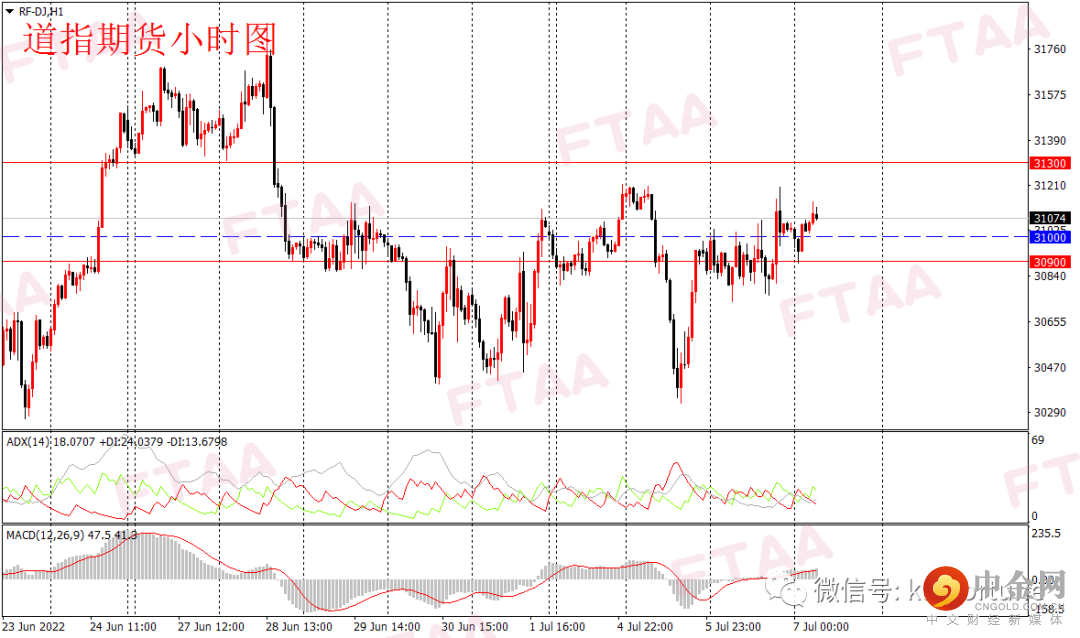 周三美股三大指数均小幅上涨,其中道指涨69点或0.23%。美联储6月会议纪要释放了更鹰派的信号,但市场此前已有所消化。指数承接前一日的止跌信号,高开后震荡,尾盘收涨。道指日图收出上下影小阳,站上5日线,短线或维持震荡偏多。道指期货方面,昨日亚欧盘时段维持震荡,美盘后段拉升。今早亚盘道指期货小幅下探后,当前回升。短线或维持偏多。操作上可持有多单,或逢低在31000附近轻仓多,止损30900,目标31300。