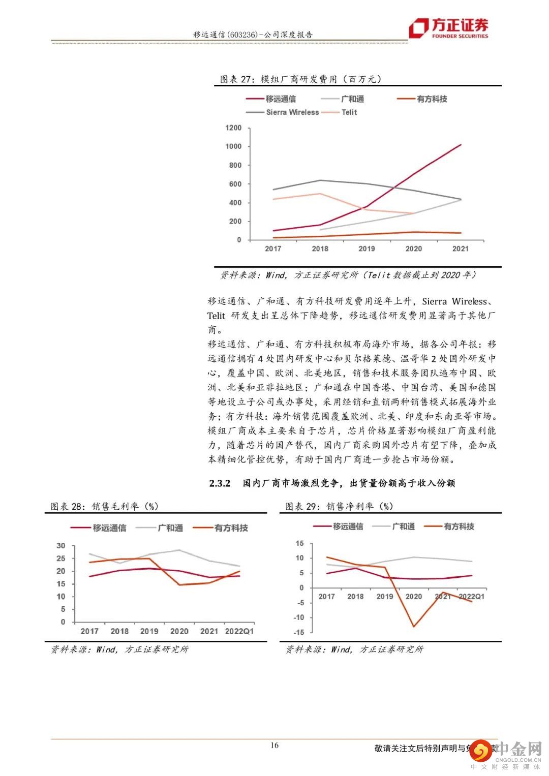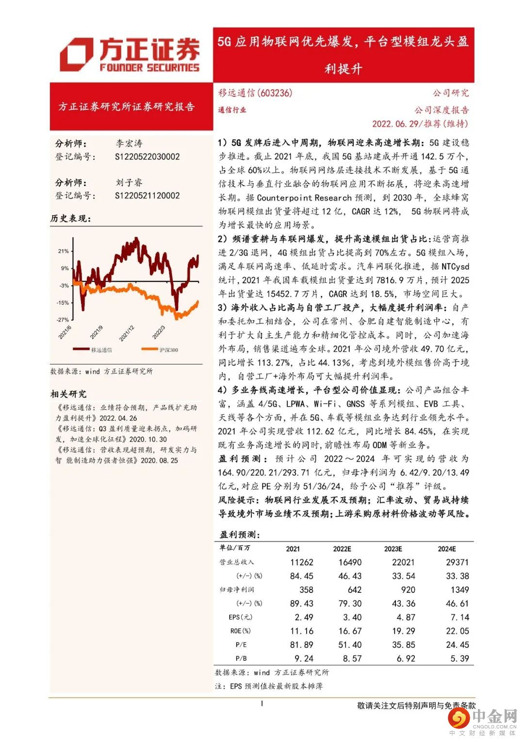4)多业务线高速增长,平台型公司价值显现:公司产品组合丰富,涵盖4/5G、LPWA、Wi-Fi、GNSS等系列模组、EVB工具、天线等各个方面,并在5G、车载等模组业务达到行业领先水平。2021年公司实现营收112.62亿元,同比增长84.45%,在实现既有业务高速增长的同时,前瞻性布局ODM等新业务。盈利预测:预计公司2022~2024年可实现的营收为164.90/220.21/293.71亿元,归母净利润为6.42/9.20/13.49亿元,对应PE分别为51/36/24,给予公司“推荐”评级。