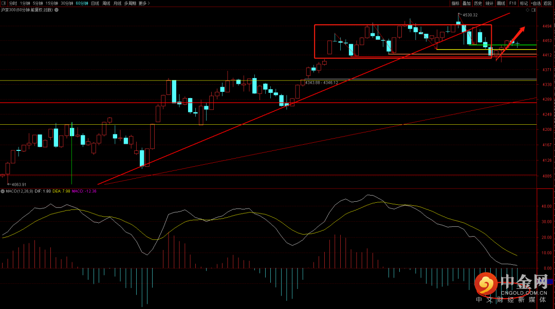 沪深300短期关注六十分钟的量柱变化,在没有出现再次扩张之前大概率还有反弹的空间,关注4503点颈线压制,如果能够突破大概率还有高点出现。下方关注4407点在收盘是否会跌破一旦出现将有概率回落到4300附近。