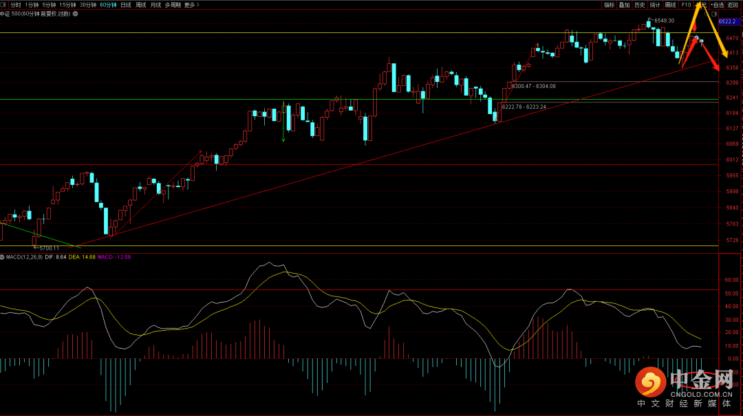 中证500短期在六十分钟上升趋势线上遇到支撑,短期再次来到6500点压制平台,这个位置无论是否能够新高都还会有再次回落的概率。关注6370点是否出现跌破一旦跌破就有回落到6120附近的可能,注意把控好节奏点。