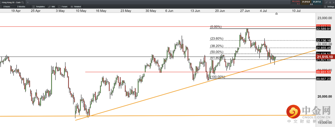 恒指自6月28日呈现连续回落趋势,但目前结构仍以上行趋势为主,因此倾向于短期的回落,当前价格正处于上行趋势线的支撑处,价格在斐波那契61.8%的回撤位附近。今日在低开后目前成功翻阳,行情或将在该区域附近再次启动。