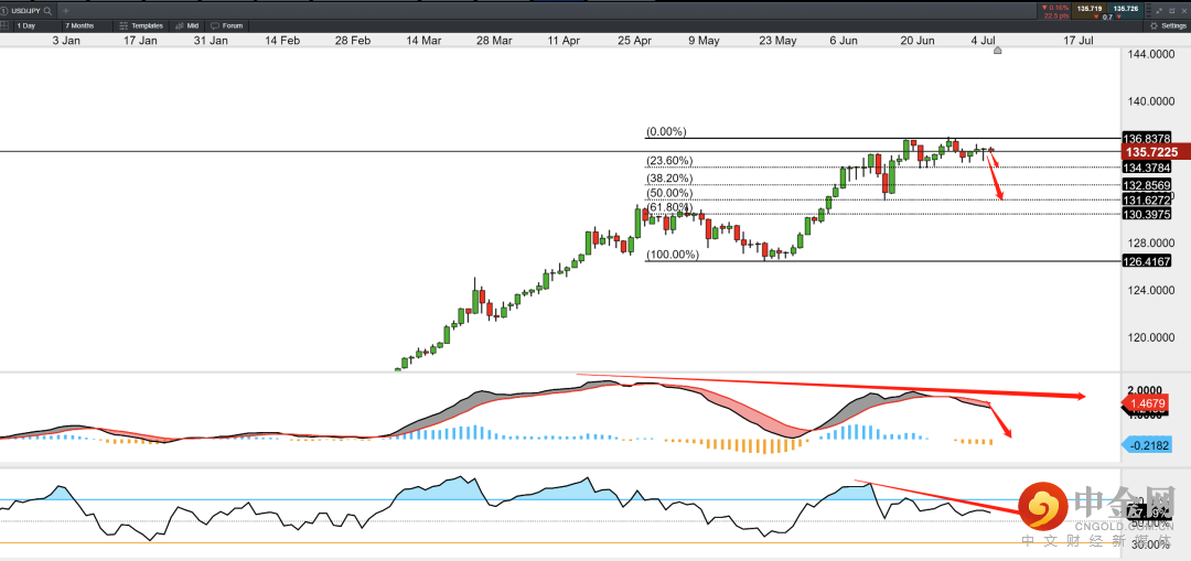 当前MACD指标呈现顶背离信号,二次出现死叉,短期或有回落风险,回落第一目标:134.38。然后是131.63。
