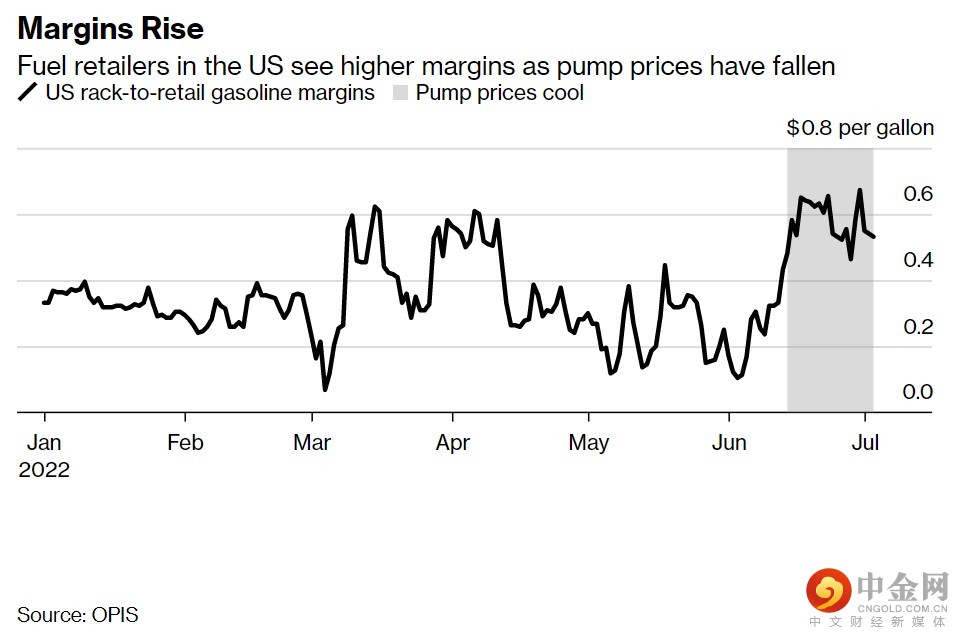 根据价格提供商OPIS和美国汽车协会(AAA)的数据,自6月14日汽油价格下跌以来,美国燃油零售商的利润升至平均每加仑56美分,是此前两个月平均水平的两倍多,当时油价大涨,6月初还出现创纪录的牛市行情。