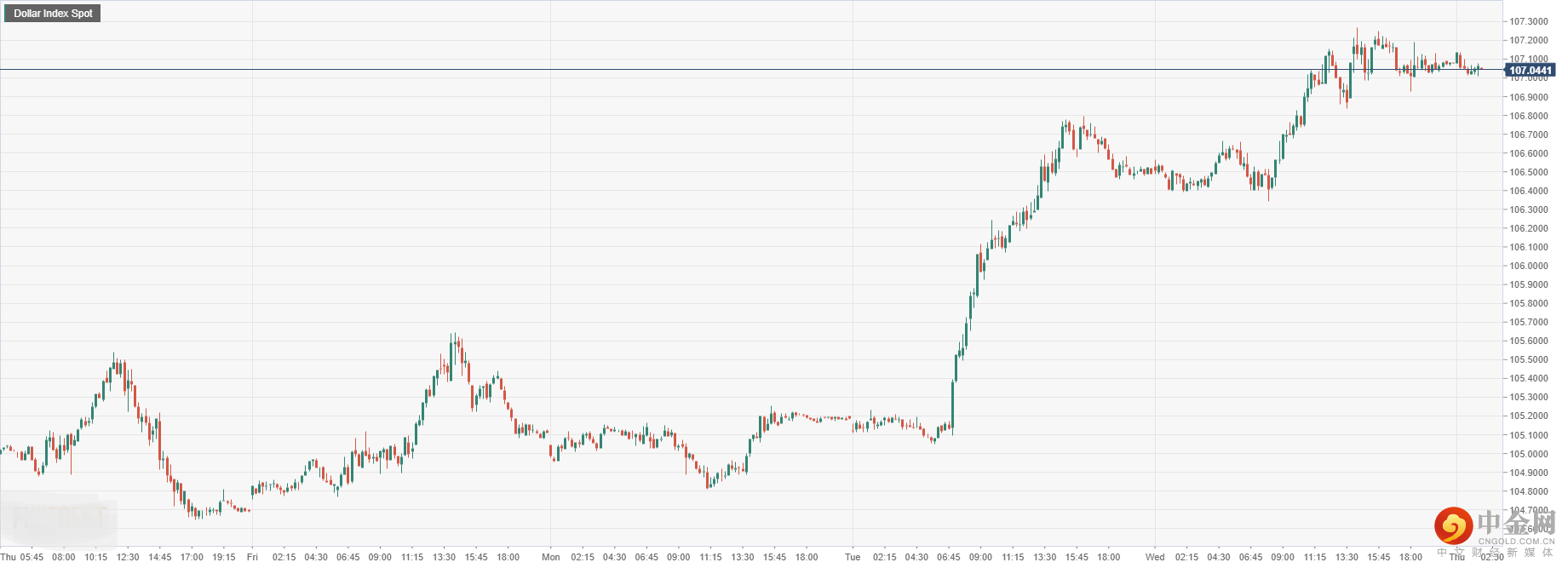 美元指数周三收盘大幅冲高后,今日开盘升0.5%至107.04附近,因美国经济数据整体利好,使得美元上行支撑提振。