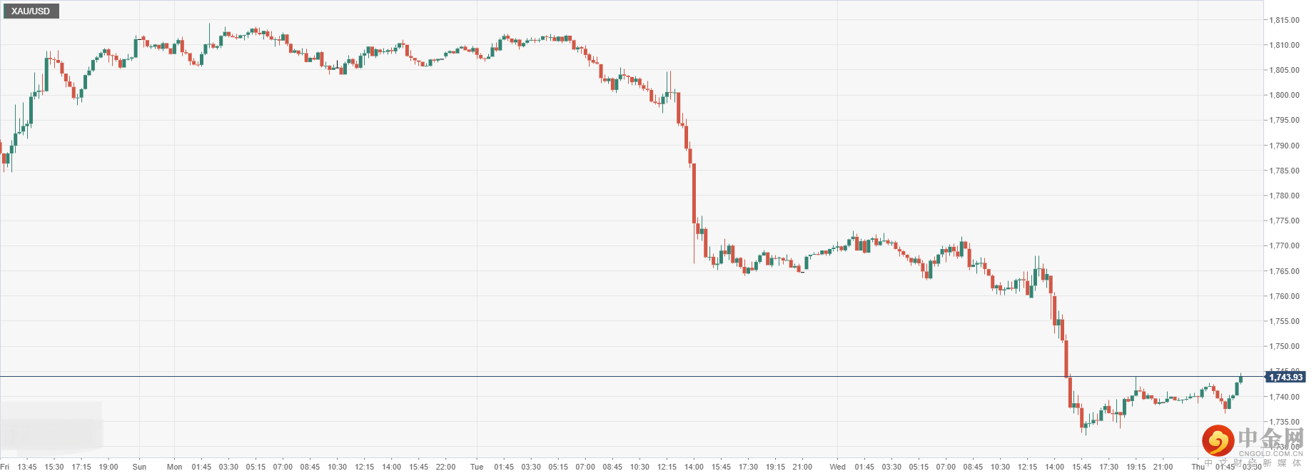 黄金兑美元周三收盘大幅回落后,今日开盘跌至1743.93附近,因美联储会议纪要确定了美联储将采取更加 限制性的货币政策,帮助美元维持强势,进而导致金价下行震荡疲软。