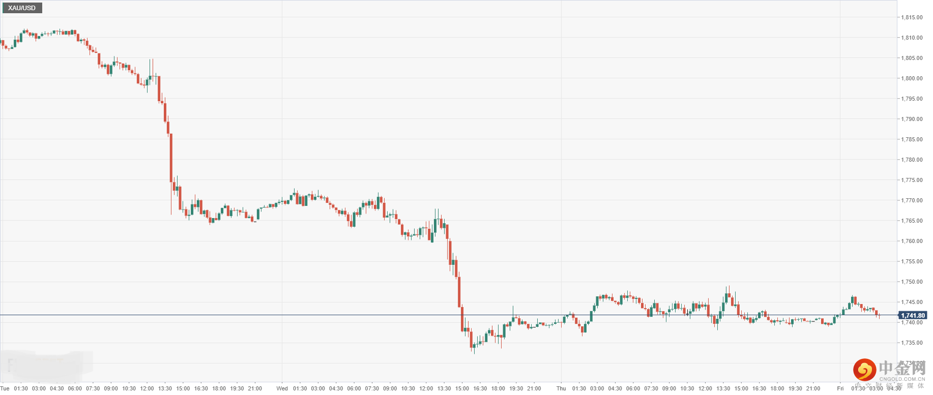黄金兑美元周四收盘维持低为盘面后,今日开盘徘徊在1741.80水平,因英美央行支持更快速度加息,金价下行震荡疲软。
