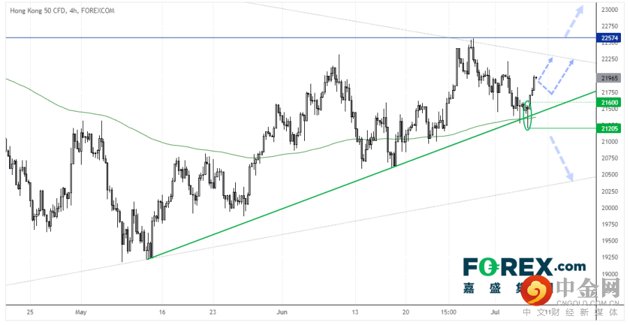 恒指收出看涨吞噬K线,收于100天指数移动均线上方,证实21,205构成支撑。价格在200期指数移动均线上方形成系列看涨pinbar,动能业已转向上涨。价格守住了上涨趋势线,后市或尝试站上22,600。但请注意,22,250一线构成趋势阻力。