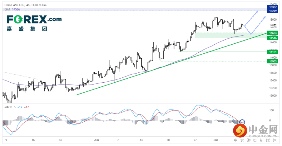 中国A50 4小时图的上涨趋势保持完好。价格已在100期指数移动均线处企稳,修正或接近尾声。守住14,500或上涨趋势线看涨,目标15,300阻力区域。