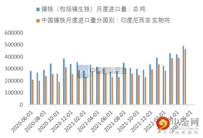 镍铁进口分析:印尼镍铁量继续创新高。2022年5月中国镍铁进口量49.21万吨,环比增加17.45%;同比增63.5%。其中,自印尼进口镍铁量46.37万吨,环比增加17.39%;同比增加76.74%。印尼的镍铁对我国镍铁进口占比超过80%。