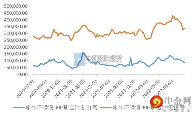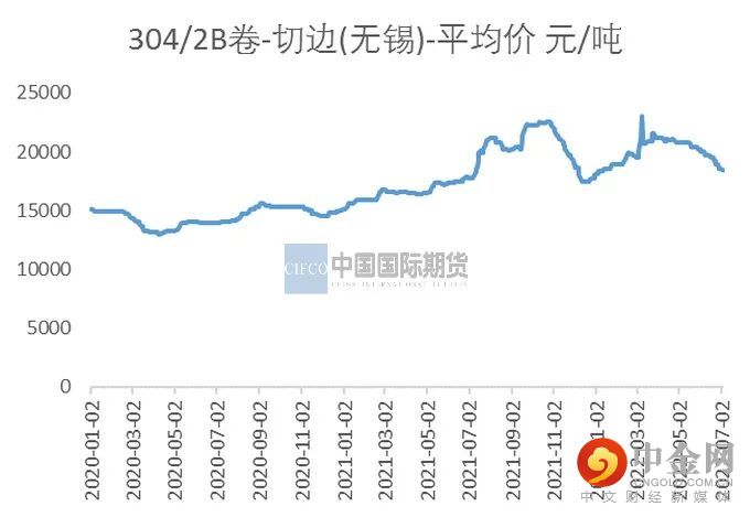 不锈钢库存情况:MYSTEEL数据显示,截止7月6日,全国冷轧300系社会库存22.21万吨,库存总体呈现下降趋势,随着持续减产,7月初迎来较快娶昆,周环比下降达到8.45%。其中佛山300系库存量为57512吨,周度环比降3.3%,无锡市场300系冷轧库存15.33万吨,周环比下降17.53%,呈现明显的下降态势。预计当前的生产利润下,7月减产持续的动力依旧,或去库会更加明显。但目前总体库存仍在高位,关注7月中下旬去库的情况,如果持续性去库,终端需求也有所恢复,或带来价格企稳。