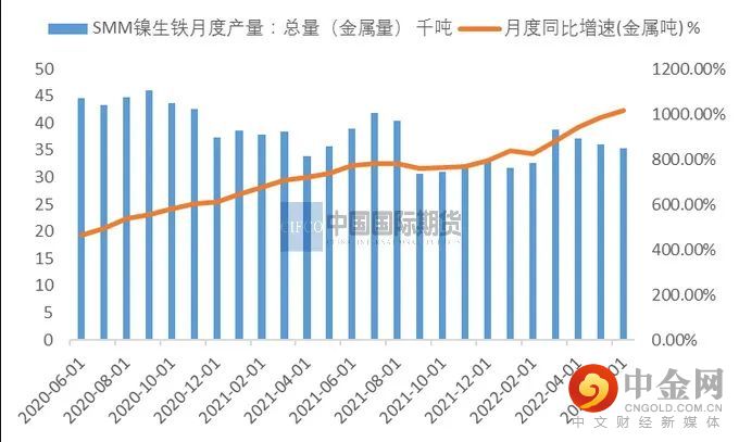 SMM数据显示,2022年6月全国镍生铁产量为808830吨,同比小幅增长3.32%,环比下降1.33%。