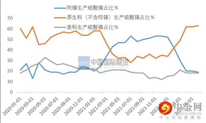 SMM数据显示,2022年6月全国硫酸镍产量11.07万吨,环比增加5.61%,同比增2.95%。根据MYSTEEL数据显示,6月硫酸镍的原料占比如下:镍豆镍粉占比继续下降至19%,原生镍提升至63%,再生镍下降至18%。纯镍的占比继续下降,被原生料,例如镍氧化镍钴、高冰镍等代替的越来越多,而随着镍铁利润不断被压减,短期内镍铁转高冰镍的动能会进一步增加,从而继续带来硫酸镍供给量增加。