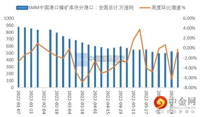 镍矿港口库存目前进入一个平衡阶段,结束了前期去库状态。截止7月初,SMM数据显示,国内港口镍矿库存504.35万吨,与6月初相比相差不大。