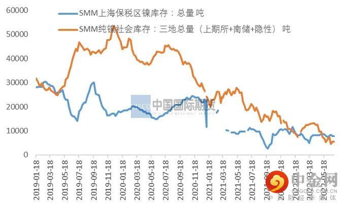 6月,SMM公布的全国电解镍产量为1.48万吨,同比增长9.07%。6月SMM公布开工率看,已经高达84.97%,位于相对高位。预计7月国内电解镍产量还有进一步提升空间。不过目前电解镍库存仍在低位,其中上海保税区镍库存7700吨,社会库存(南储+隐性+上期所)5437吨,总库存同比下降21.18%,继续创下新低。目前精炼镍整体升贴水位于高位,现货资源仍相对紧张。7月如果开工率进一步提升,或对低库存有所改善。