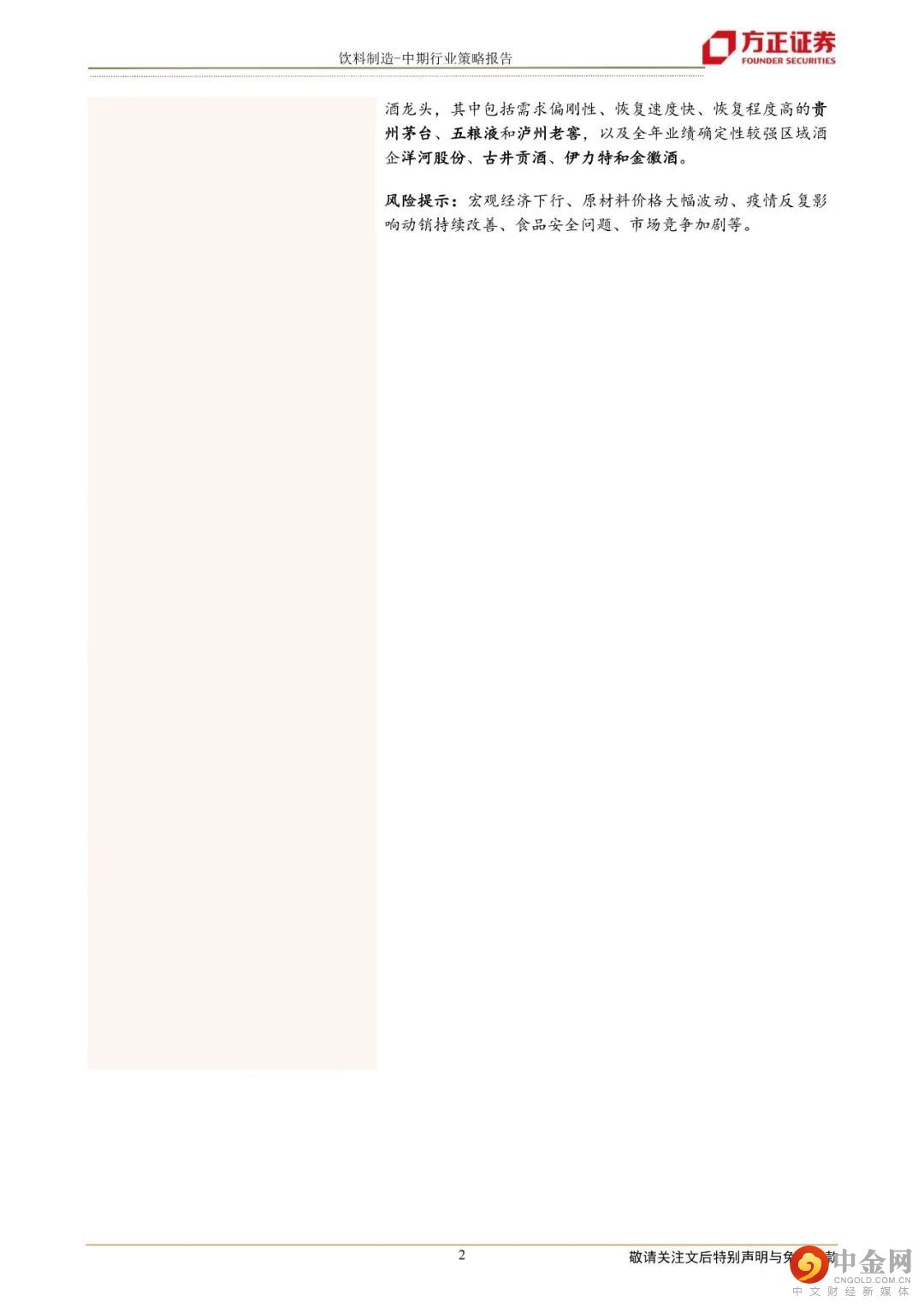 投资建议:在当前疫情恢复以及消费复苏的背景下,我们首先建议重点布局估值修复后具备基本面支撑的高端白酒和区域白酒龙头,其中包括需求偏刚性、恢复速度快、恢复程度高的贵州茅台、五粮液和泸州老窖,以及全年业绩确定性较强区域酒企洋河股份、古井贡酒、伊力特和金徽酒。