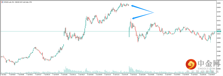 类似的交易机会也出现在了日本股市,在前首相遇刺的同时,日经225指数(JPN225)正处于午间休盘,为空头交易者(价格下跌而获利的交易者)提供了入场机会,当股市下午再次开盘后,该股指跳空低开近300点。