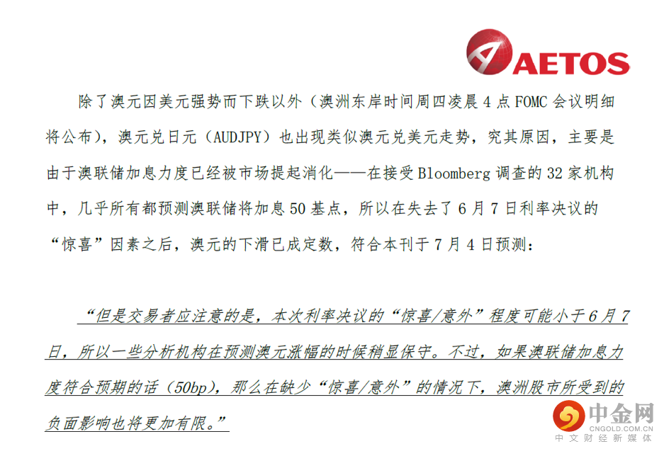 7月4日发布的《AETOS每日汇评》对澳美货币精准预测