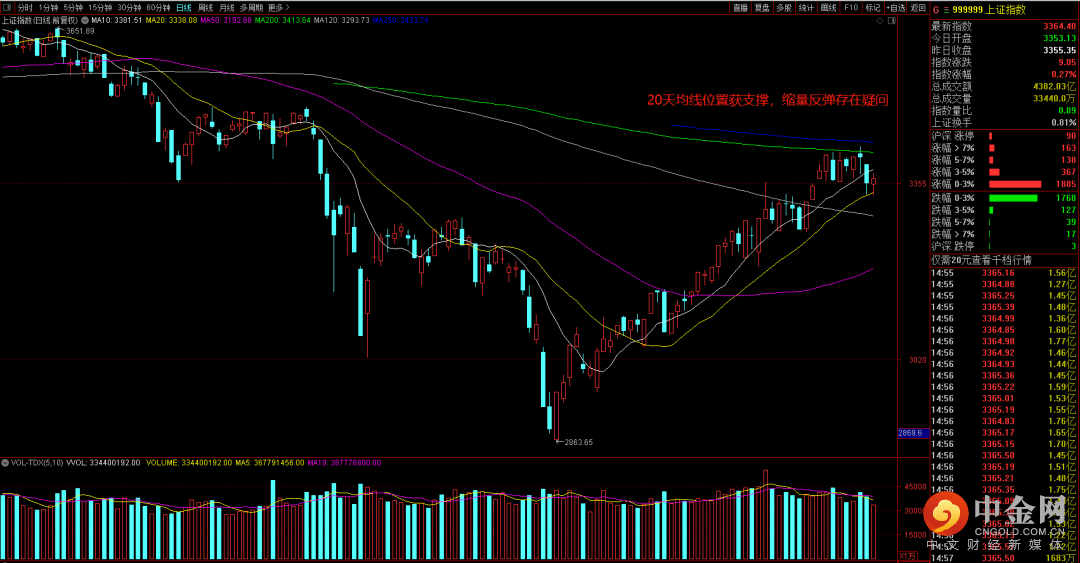 【技术分析】沪指昨日缩量反弹,在跌破10天均线后,市场在20日均线获得初步支撑,但存在疑问的是反弹过程中并未有足够的成交量跟进。当然,市场若能就此20天均线位置止跌是市场冲击年线前的积极下蹲。但若市场失守20天均线,或需要盘整更长时间而下一道支撑位置或将是半年线位置。