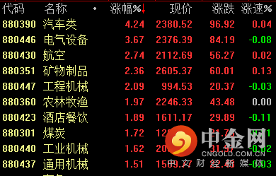 其中,汽车类板块大涨4.24%,东箭科技20%涨停,福田汽车、贵航股份、银轮股份、广东鸿图等个股掀起涨停潮。