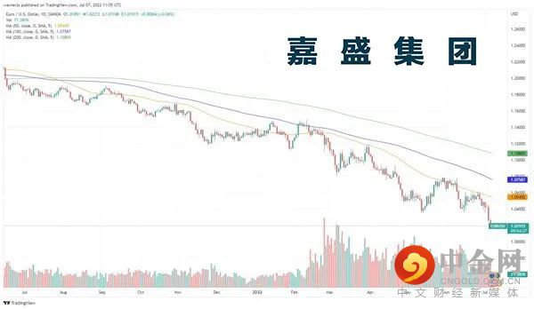该货币对2002年以来首次接近于平价。欧元/美元的跌势持续了一年多,在7月初触及1.03。市场因此热议是否将到达1.00。
