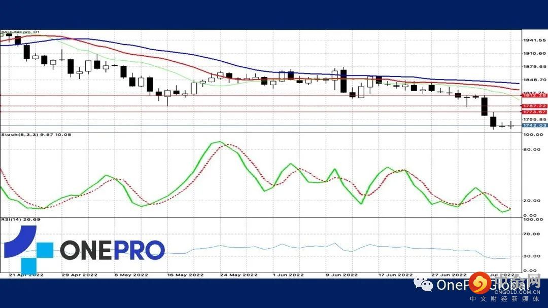 黄金的日线技术线图中,Alligator死亡交叉除此之外,KD处于低档钝化的格局,在长线与短线都是偏向空方的状况下,投资人尽量要偏空看待行情,尽量不要有猜底的行为。