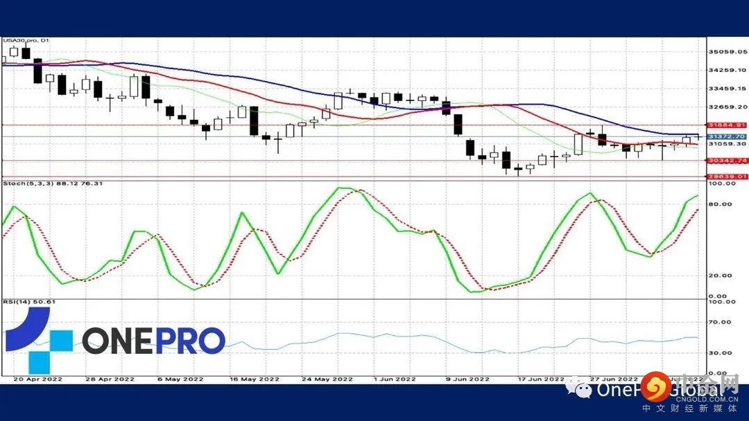 道琼指数的Alligator呈现死亡交叉表示长线的道琼指数还是偏向空方,不过短线的KD已经形成高档钝化,所以上冲的力道已经较为强势,现阶段就是看上涨的力道是不是可以突破区间的压力,继续走高挑战的机会很大。