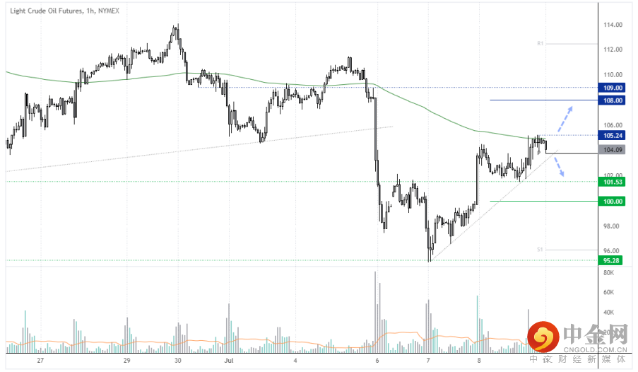 西得州原油小时图形成了上涨趋势,但受制于200期指数移动均线。价格目前守住上升趋势线,站上105.30,涨势延续可期,后市可能上看108;如果下破趋势线,空头可能先后下看102和100支撑位。