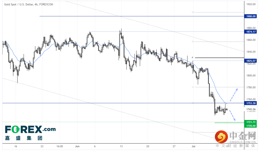 金价交投于下跌通道内,目前围绕1740盘整。上档阻力在20期指数移动均线和1753,后市倾向于下探1720支撑区域。但若在当前价位附近构筑看涨反转形态,比如pinbar或看涨吞噬K线,并且站上1755,可能正在展开回调,后市重点关注1780/月图第一支撑中枢。