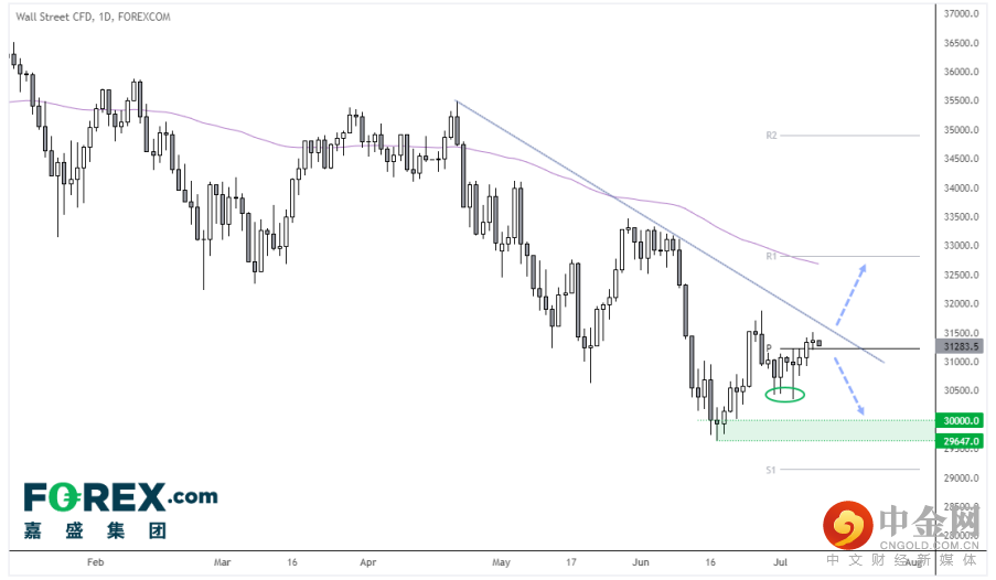 道指日图下跌趋势不改,但回调似有扩大的潜力。价格回到30,000上方且构筑一个上抬的低点,同时形成系列下影线,表明30,500附近筑有买需。如果可以攻克趋势线,后市上看月图第一阻力中枢,那在100天指数移动均线附近。但若在趋势线附近出现看跌反转K线,可能下探30,000支撑区域。