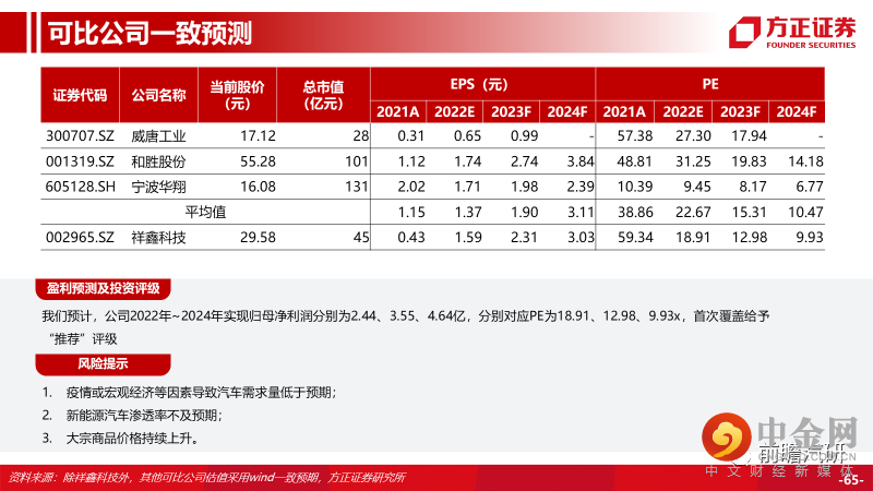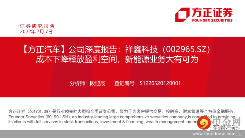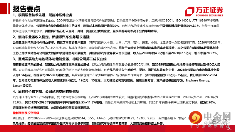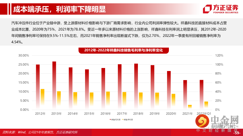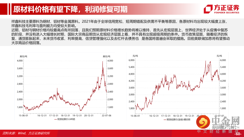 汽车冲压件行业位于产业链中游,受上游原材料价格影响,行业内公司利润率弹性较大。祥鑫科技的直接材料成本占营业成本比重,2020年为75%,2021年为78.8%。其2012年-2020年间销售净利率可保持在9.5%-11.5%左右,而受近年来原材料价格上升影响,其2021年销售净利率出现断崖式下跌,仅为2.70%。近期原材料价格已逐渐回落,公司的盈利空间有望逐渐回复。