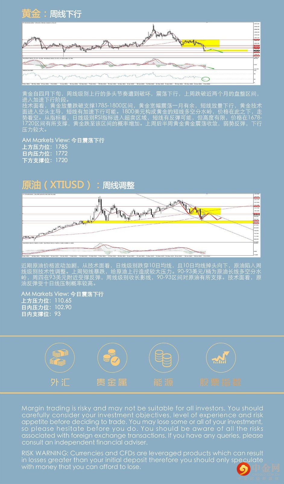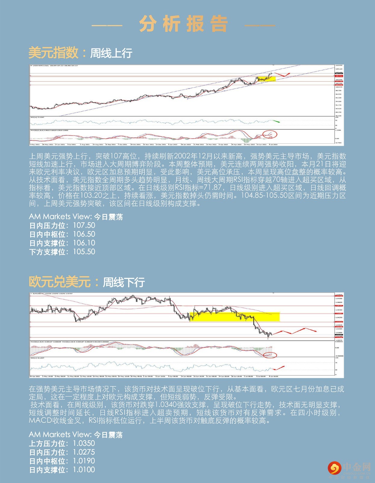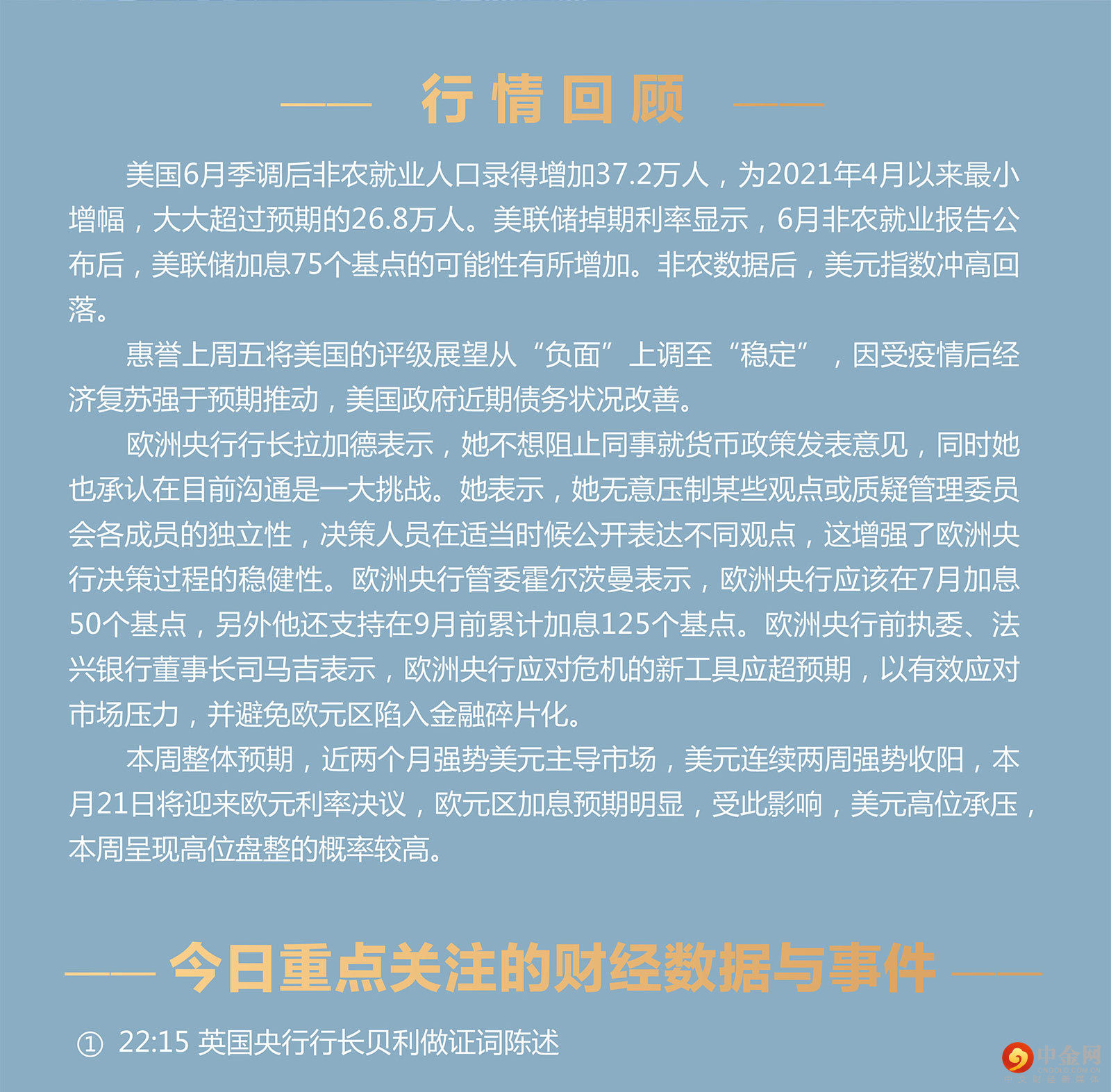 美国6月季调后非农就业人口录得增加37.2万人,为2021年4月以来最小增幅,大大超过预期的26.8万人。美联储掉期利率显示,6月非农就业报告公布后,美联储加息75个基点的可能性有所增加。非农数据后,美元指数冲高回落。 惠誉上周五将美国的评级展望从“负面”上调至“稳定”,因受疫情后经济复苏强于预期推动,美国政府近期债务状况改善。 欧洲央行行长拉加德表示,她不想阻止同事就货币政策发表意见,同时她也承认在目前沟通是一大挑战。她表示,她无意压制某些观点或质疑管理委员会各成员的独立性,决策人员在适当时候公开表达不同观点,这增强了欧洲央行决策过程的稳健性。欧洲央行管委霍尔茨曼表示,欧洲央行应该在7月加息50个基点,另外他还支持在9月前累计加息125个基点。欧洲央行前执委、法兴银行董事长司马吉表示,欧洲央行应对危机的新工具应超预期,以有效应对市场压力,并避免欧元区陷入金融碎片化。 本周整体预期,近两个月强势美元主导市场,美元连续两周强势收阳,本月21日将迎来欧元利率决议,欧元区加息预期明显,受此影响,美元高位承压,本周呈现高位盘整的概率较高。
