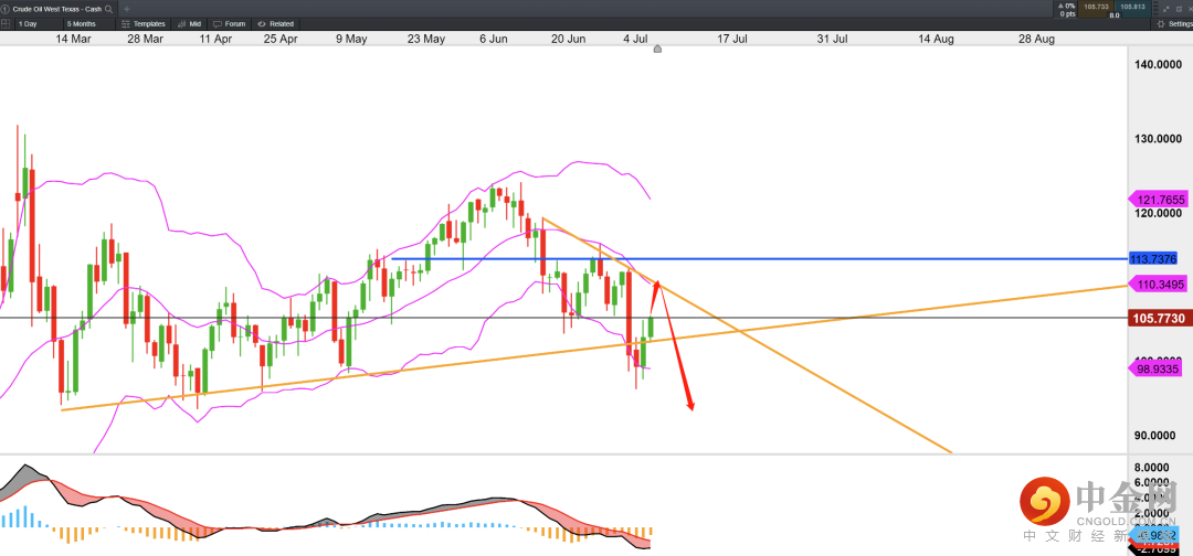 WTI原油上周四、五迎来底部反弹,倾向于短期的空头修复,趋势上以震荡下行为主。上方面临趋势线(图中黄线)和布林带中轨压力,价格为110。本周拜登访问沙特或商讨原油增产计划,经济下行引发的需求担忧难以支撑油价的多头。因此,策略上以逢高看空为主。