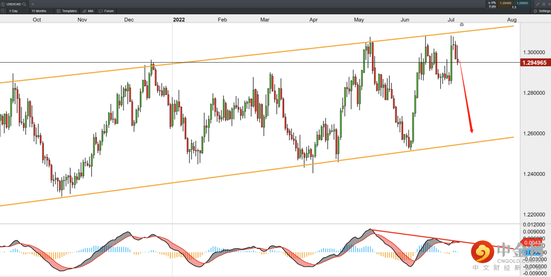 美元兑加元目前仍运行于震荡上行通道中,但在1.3面临强压力。MACD指标有再次形成死叉迹象,指标背离明显。本周加拿大央行若进行加息75bps的行动,将对加元起到较大提振,因此美加本周倾向于高位回落。下方目标:1.26。