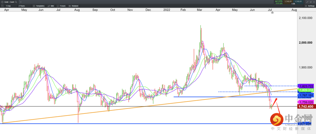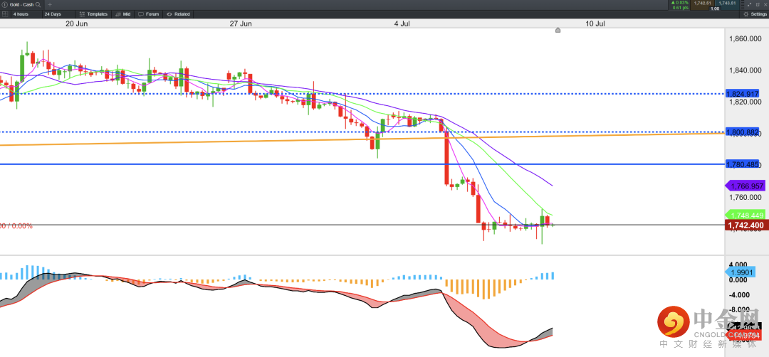 黄金上周在跌破日线级别上升趋势线支撑1800后,继续迎来破位下跌,并再次跌破今年1月低点1780。目前价格在1740附近盘整。均线系统呈现空头排列,当前趋势以空头为主。在7月加息落地前金价或难有起色,预计价格或进一步承压下行。4小时MACD出现底部金叉,短期内价格或有空头修复。当前策略以逢高看空为主,上方阻力:1780。下方目标价:1675-1680。