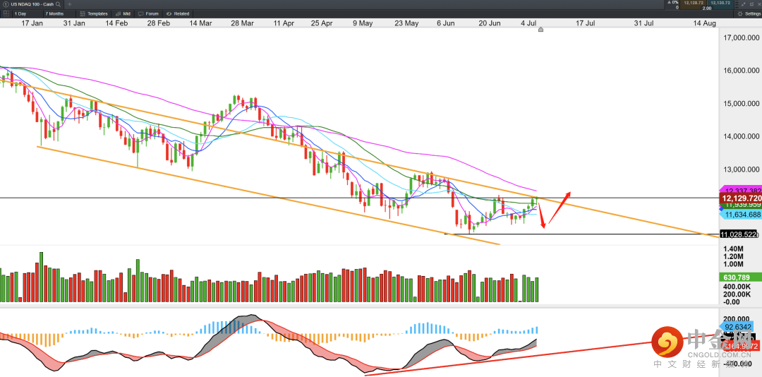 纳指上周呈现强势反弹趋势,录得4日连阳,但整体价格仍处于下行通道中,暂未出现有效突破,需观察价格能否突破60日均线的压制。均线系统暂未出现明显的多头排列,投资者仍需保持耐心观察。由于本周将公布CPI数据,市场普遍预期6月CPI将续刷记录。若数据出现符合或超预期的表现,将强化美联储7月加息75bps的预期,美股仍将承压,但预计价格持续运行于11000之上。本周预计维持震荡趋势,策略以逢低看多为主。
