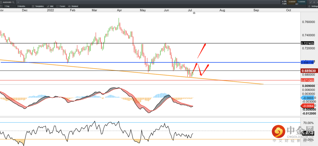 澳元兑美元在震荡下行下轨(图中黄线)0.676附近受到较强支撑,MACD指标有底部背离迹象,RSI指标有重回多头区间之势,预计该位置将面临反弹之势,但由于本周在美国通胀数据的影响下,美联储加息75bps的预期增强将使美元偏强。因此反弹空间有限。上方的重要压力在0.7。若价格不能突破该位置,或维持低位震荡趋势。若成功突破0.7并企稳,下一目标关注0.727。