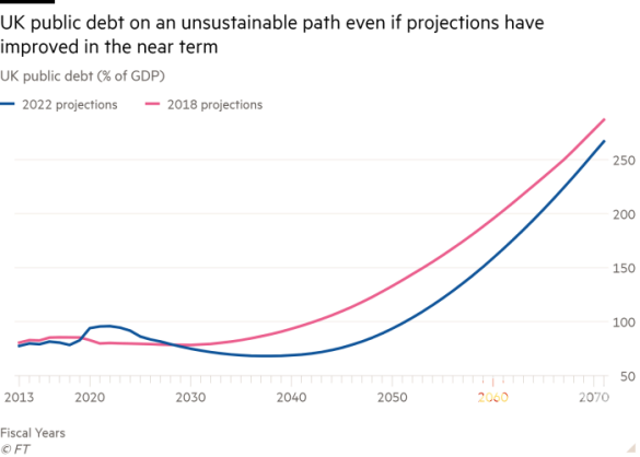 OBR表示,苏纳克的税收优惠措施将使英国在本世纪末之前保持较低的借贷水平,其核心预测是,公共债务占国民收入的比例将逐步下降,直到本世纪中叶。