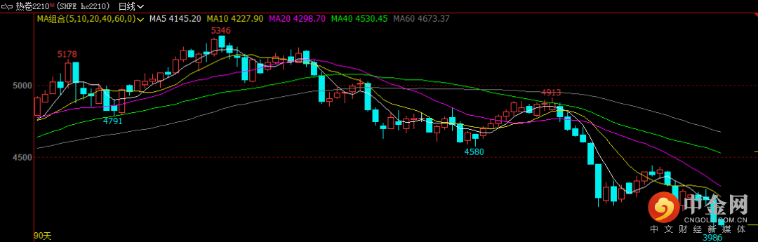 继上周五夜盘大跌后,今日钢材期货盘中继续走低,下探至近两年新低,带动整个黑色系出现全线下跌。其中,螺纹钢主力2210合约日内最低跌至3971元/吨,热卷主力2210合约下探至3986元/吨,触及20个月以来的新低。与此同时,现货市场价格同样走低,市场恐慌情绪蔓延。