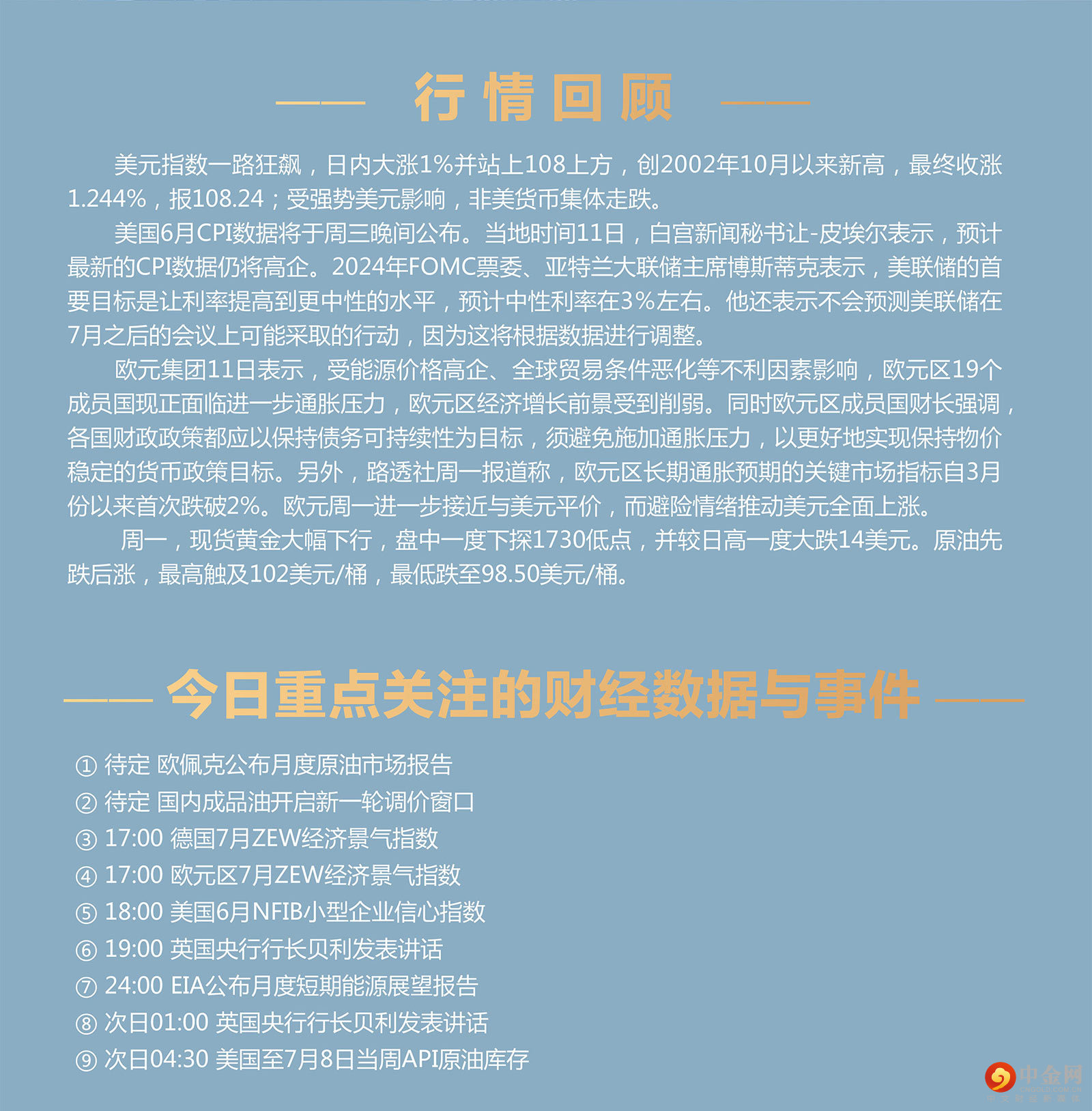 美元指数一路狂飙,日内大涨1%并站上108上方,创2002年10月以来新高,最终收涨1.244%,报108.24;受强势美元影响,非美货币集体走跌。 美国6月CPI数据将于周三晚间公布。当地时间11日,白宫新闻秘书让-皮埃尔表示,预计最新的CPI数据仍将高企。2024年FOMC票委、亚特兰大联储主席博斯蒂克表示,美联储的首要目标是让利率提高到更中性的水平,预计中性利率在3%左右。他还表示不会预测美联储在7月之后的会议上可能采取的行动,因为这将根据数据进行调整。 欧元集团11日表示,受能源价格高企、全球贸易条件恶化等不利因素影响,欧元区19个成员国现正面临进一步通胀压力,欧元区经济增长前景受到削弱。同时欧元区成员国财长强调,各国财政政策都应以保持债务可持续性为目标,须避免施加通胀压力,以更好地实现保持物价稳定的货币政策目标。另外,路透社周一报道称,欧元区长期通胀预期的关键市场指标自3月份以来首次跌破2%。欧元周一进一步接近与美元平价,而避险情绪推动美元全面上涨。 周一,现货黄金大幅下行,盘中一度下探1730低点,并较日高一度大跌14美元。原油先跌后涨,最高触及102美元/桶,最低跌至98