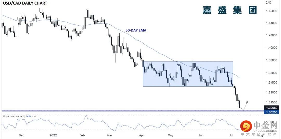 我的同事Joe Perry已在今天早些时候公布的文章本周重点关注货币对中详尽阐述了美元/加元的技术面前景,我们把重点放在欧元/加元上。这个跨大西洋的货币对可能走出13个交易日中的第10个下跌日,期间摆脱了1.3400-1.3800的陈旧区间,下个重要的长期支撑位在1.3025一线,那是2015年4月低点及横盘区间的“测量目标”相汇处。货币对近期下跌后严重超卖,周中可能在加拿大央行的任何温和暗示下自此支撑位逆势反弹。