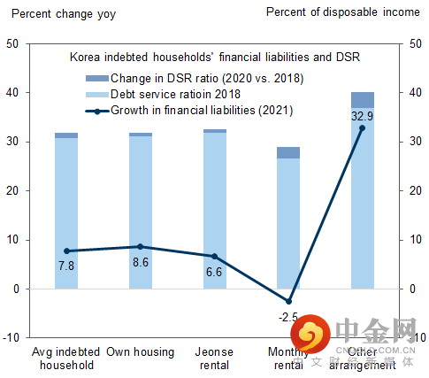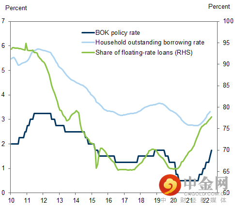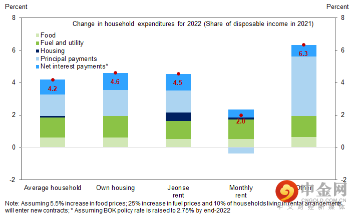 高盛预计到2022年年底,家庭在债务偿还、住房、食品和燃料方面的支出可能会增加可支配收入的4.2%。如果韩国银行的政策利率按照目前市场预期轨迹运行,在2022年末上调到2.75%,家庭贷款利率也将上调,那么家庭的净利息支出将达到家庭可支配收入的0.9%。