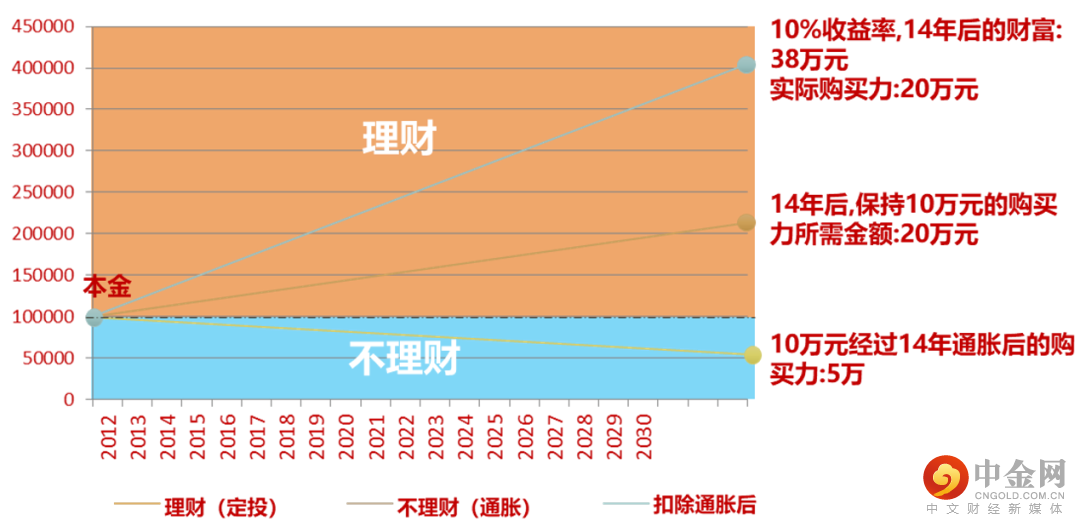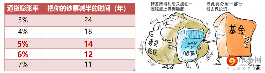 看似微不足道的通货膨胀,侵蚀力量究竟有多强大呢?以10 万元、年5%的通货膨胀率为例,你手中钞票的购买力在不到15年的时间,就会贬值51%。