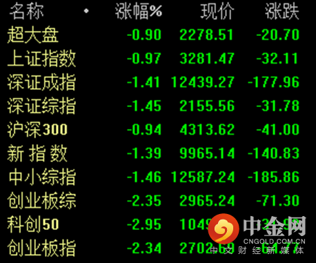 【基本股指】沪深两市昨日低开低走,市场在早盘小幅反弹翻红后便开始震荡回落,午后企图反弹无果后再度震荡下行。沪指再度失守3300点整数关口,而创业板、科创板等中小盘个股抛售压力更加明显。截至收盘,沪指跌0.97%,深成指跌1.41%,创业板指跌2.34%,成交跌破万亿关口。