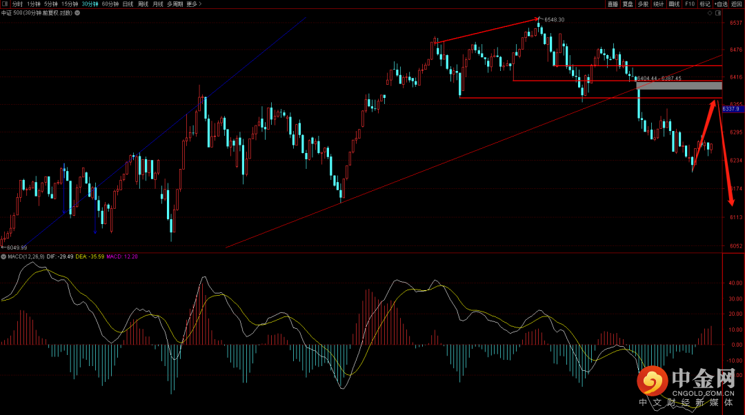 中证500短期出现三十分钟的背驰段结构,在没有跌破6200的情况下大概率会出现反弹到6257附近,而一旦跌破6142点就可能会出现加速下杀的走势,重点关注日线macd量柱的变化,在没有收敛之前大概率继续维持下跌走势。